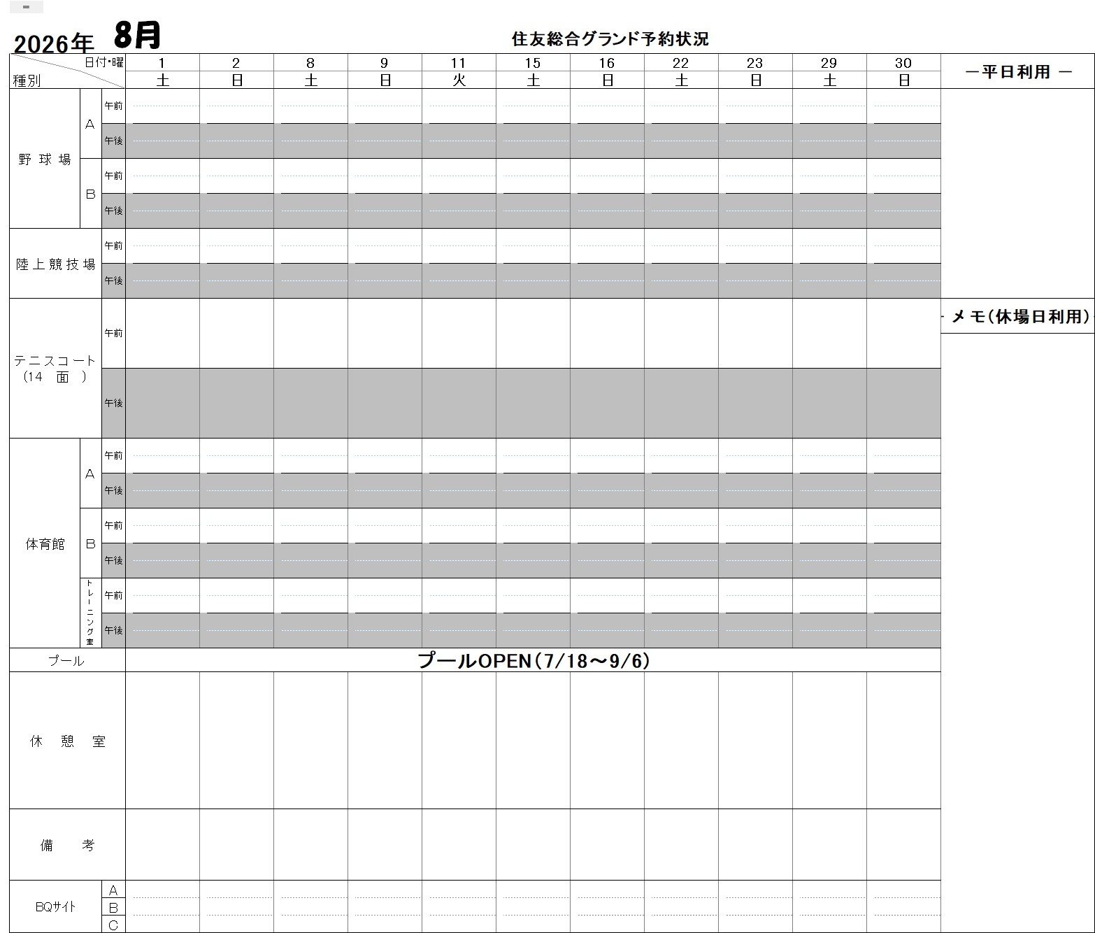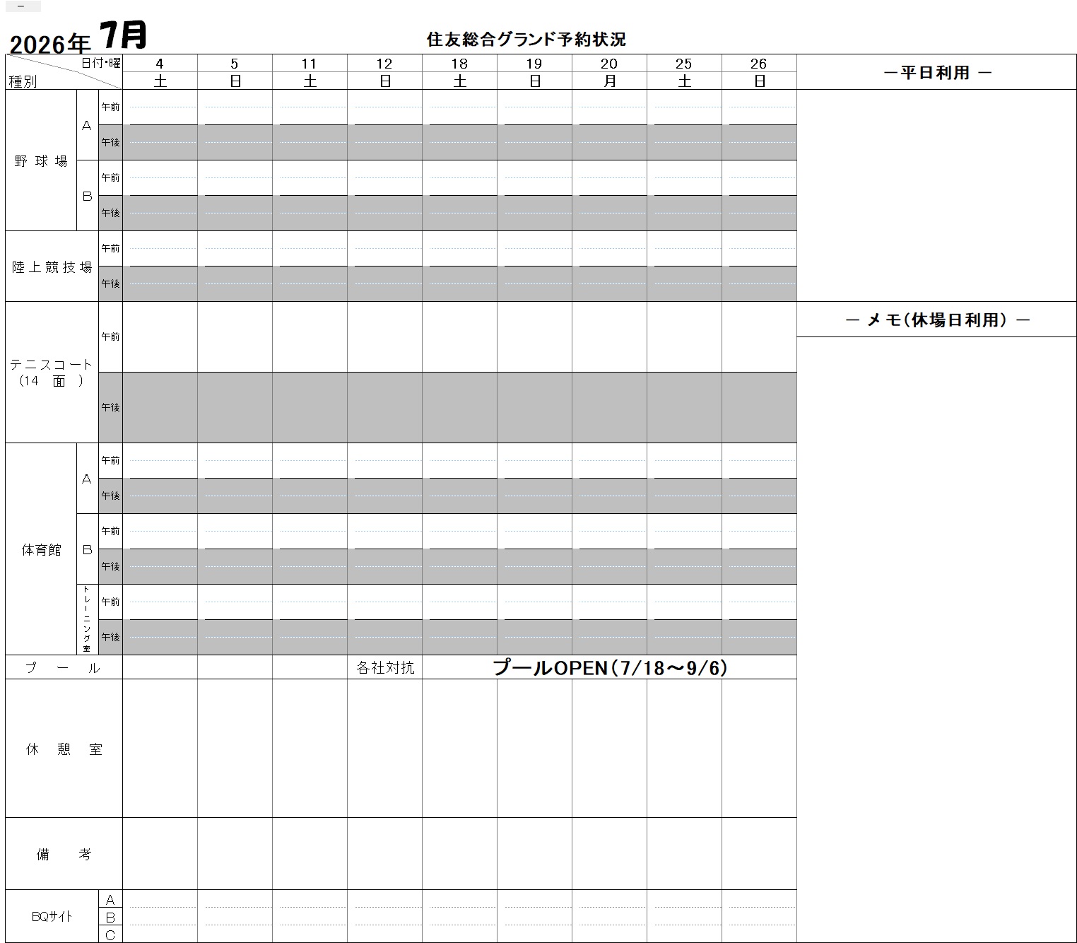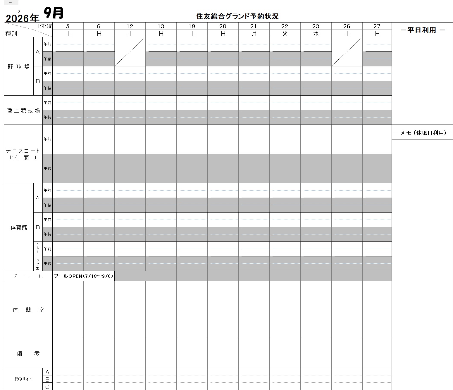 空き状況については総合グランドまでお電話いただけるとお答えできます。